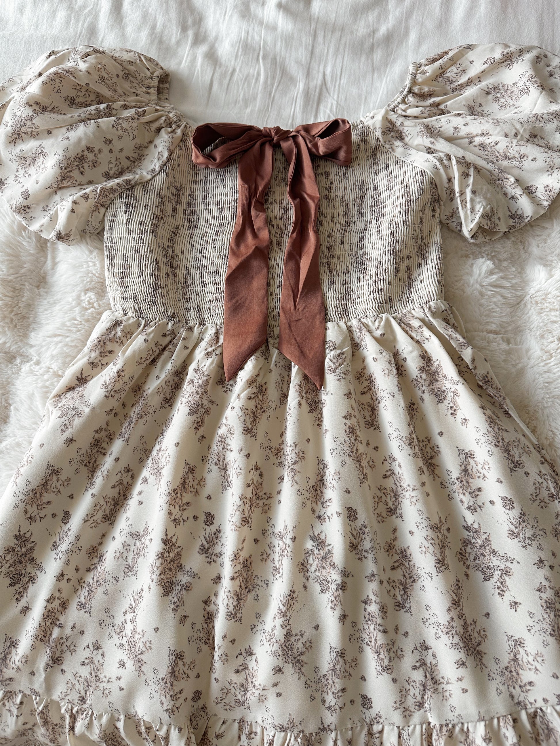 The Autumn Blossom Dress is white with a floral pattern and features a brown bow at the neck. It has a light, airy look that’s perfect for the outdoors. The combination of white and brown gives it a soft, elegant feel, making it great for both casual and slightly dressier occasions.