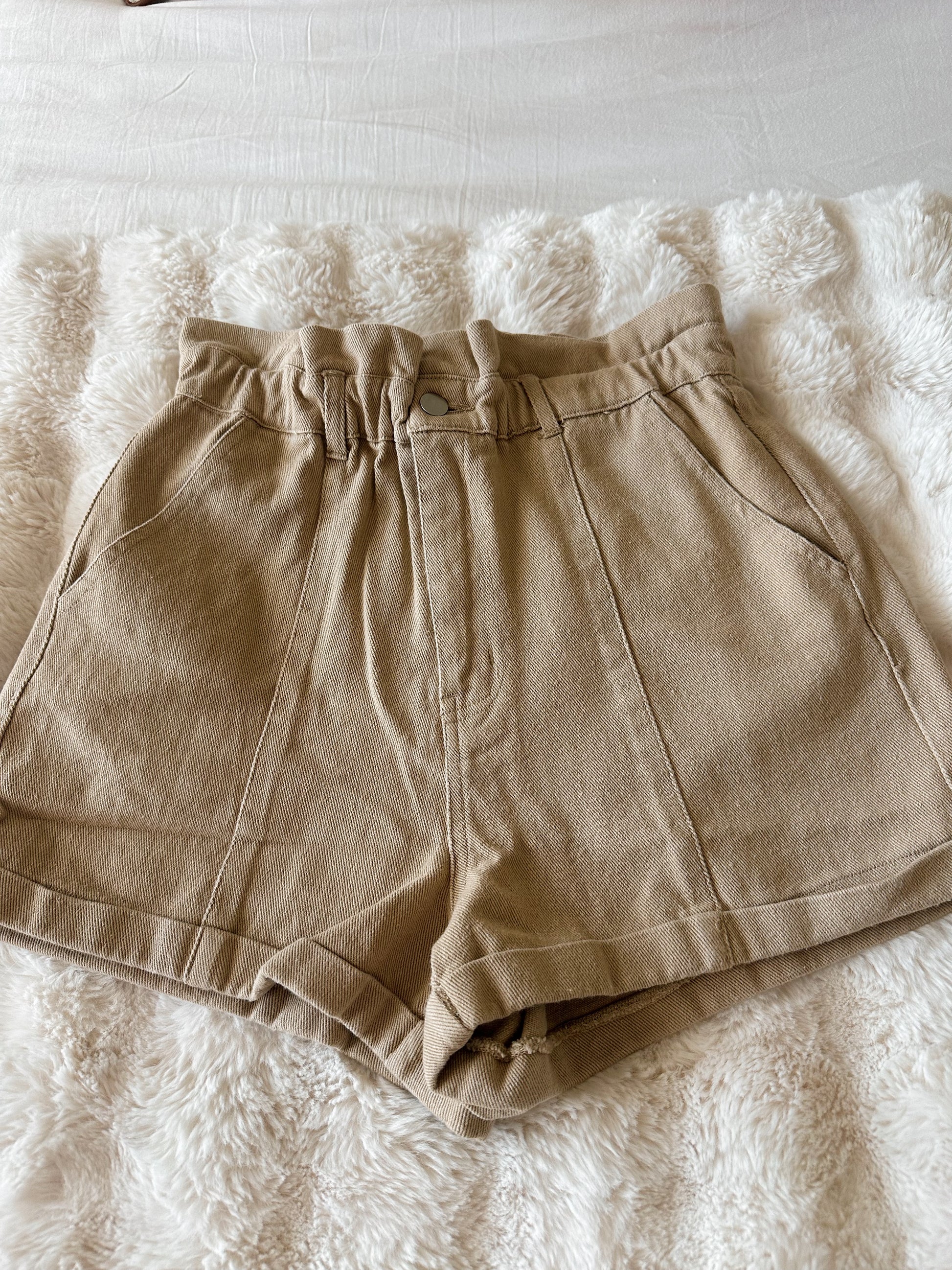 The Tan Buttoned Shorts are high-waisted and they feature a button closure at the front, an elastic waistband for extra comfort, and front pockets. The hem is cuffed, giving them a neat, stylish finish. They look casual and perfect for warm weather.